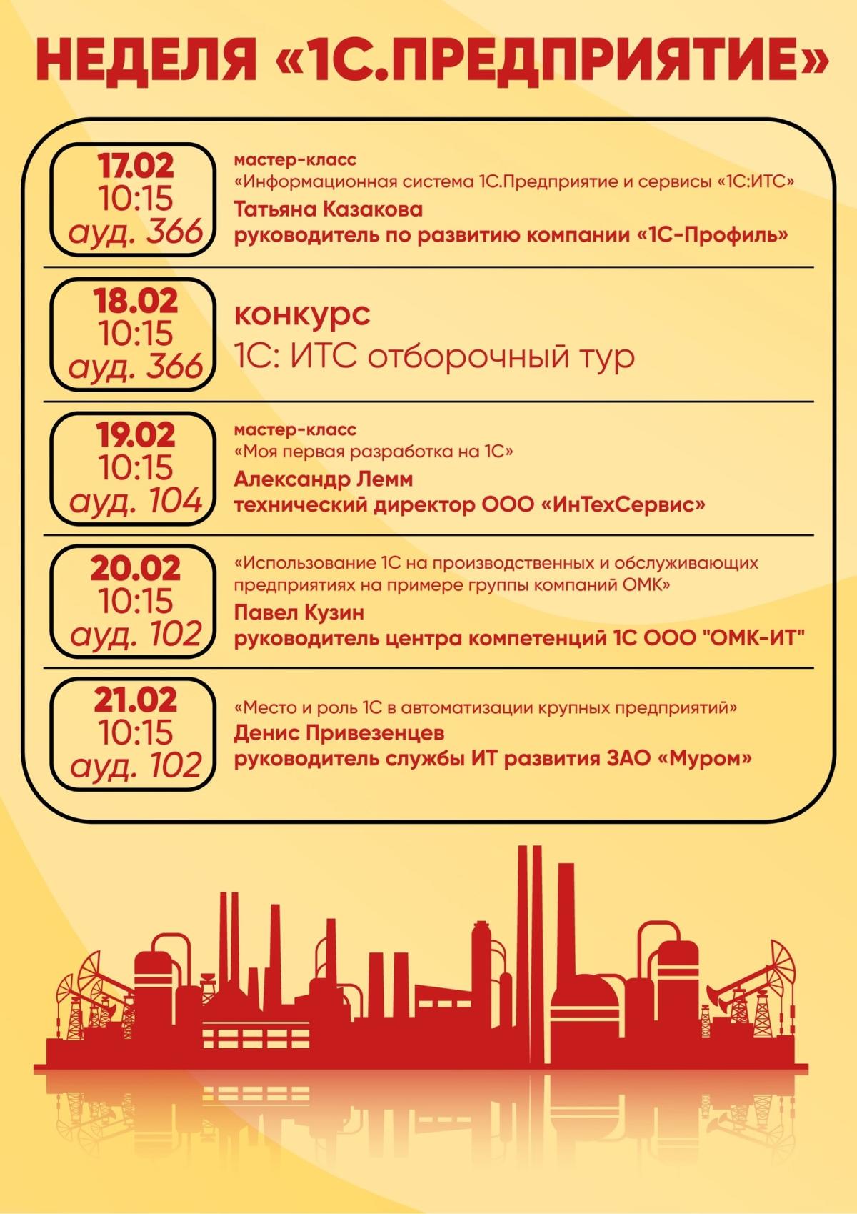 Третья учебная неделя в МИ ВлГУ посвящена программным продуктам "1С.Предприятие". Приглашаем вас взглянуть на них глазами и пользователя, и разработчика, поучаствавать в мастер-классах, изучить возможности 1С для любого вида бизнеса, узнать и обсудить ближайшие перспективы развития!