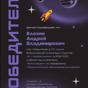 Поздравляем студента 5 курса педагогического направления, будущего преподавателя иностранных языков Андрея Блохина, который стал победителем в VIII сезоне Всероссийской олимпиады студентов «Я — профессионал» по направлению «Педагогическое образование»!