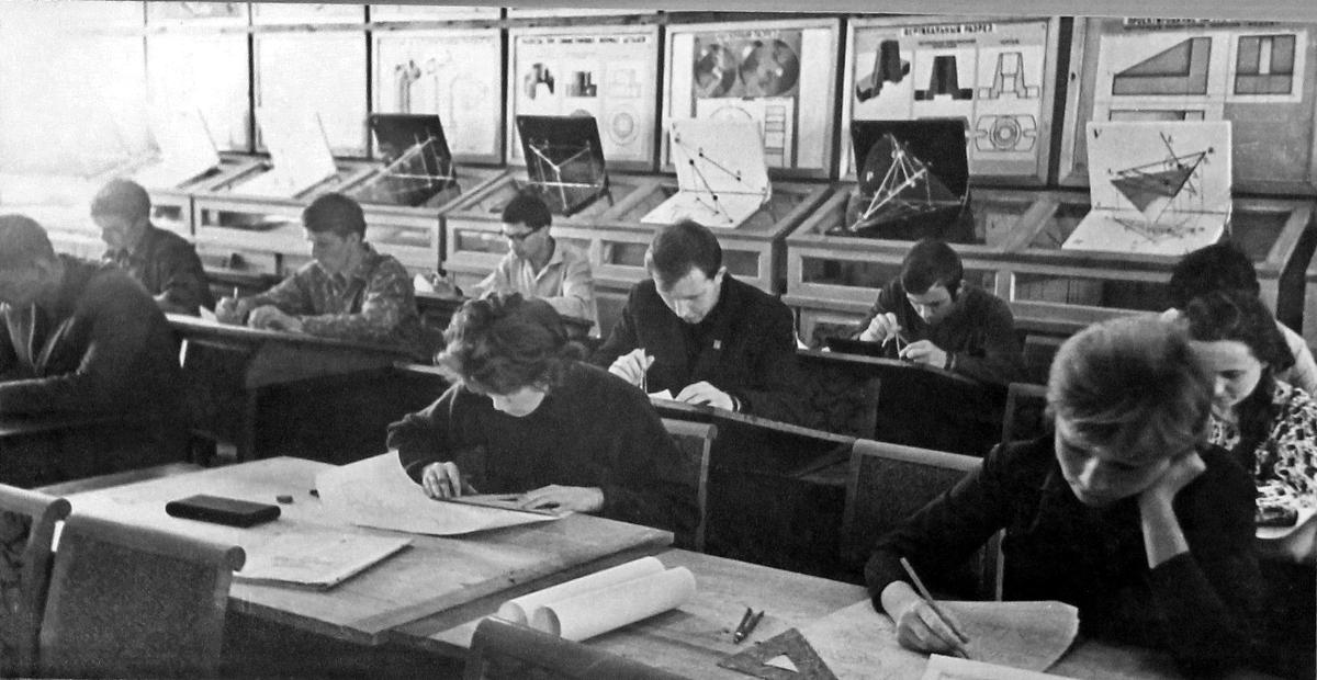 В этой аудитории рождались пространственное мышление и первые чертежи, мир делился на три плоскости проекций, а циркуль и угольник были главными инструментами созидания. И все это - «Начертательная геометрия».