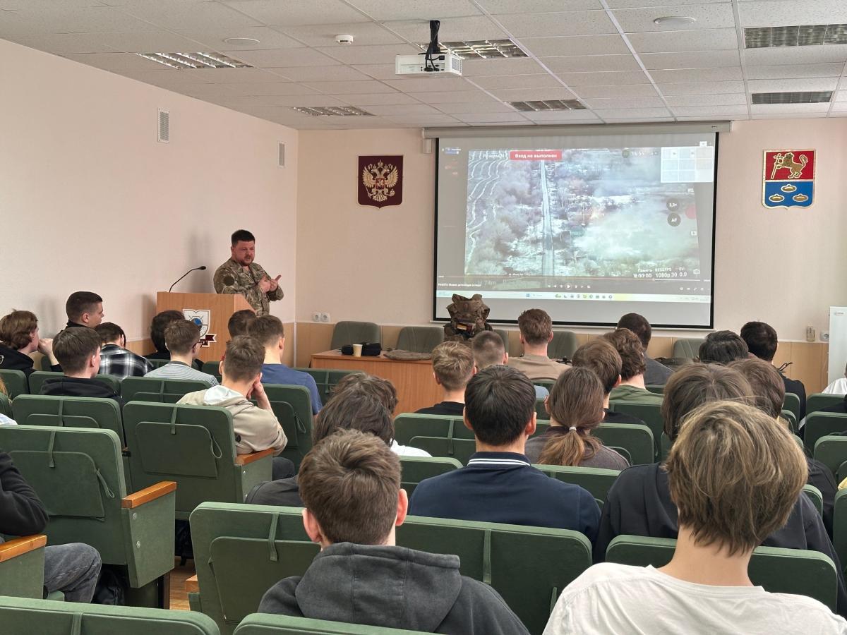 В 2024 году Виталий ушел добровольцем на СВО, и очень честно, без прикрас рассказал студентам, как и почему принял такое решение, какие боевые задачи выполнял, показал фото и видео фронтовой и бытовой жизни участников операции.